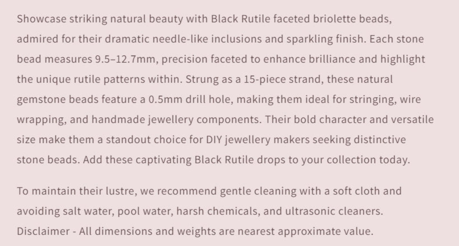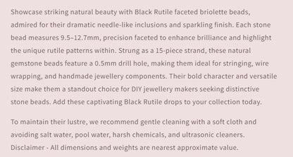 Showcase striking natural beauty with Black Rutile faceted briolette beads, admired for their dramatic needle-like inclusions and sparkling finish. Each stone bead measures 9.5–12.7mm, precision faceted to enhance brilliance and highlight the unique rutile patterns within. Strung as a 15-piece strand, these natural gemstone beads feature a 0.5mm drill hole, making them ideal for stringing, wire wrapping, and handmade jewellery components. Their bold character and versatile size make them a standout choice for DIY jewellery makers seeking distinctive stone beads. Add these captivating Black Rutile drops to your collection today.