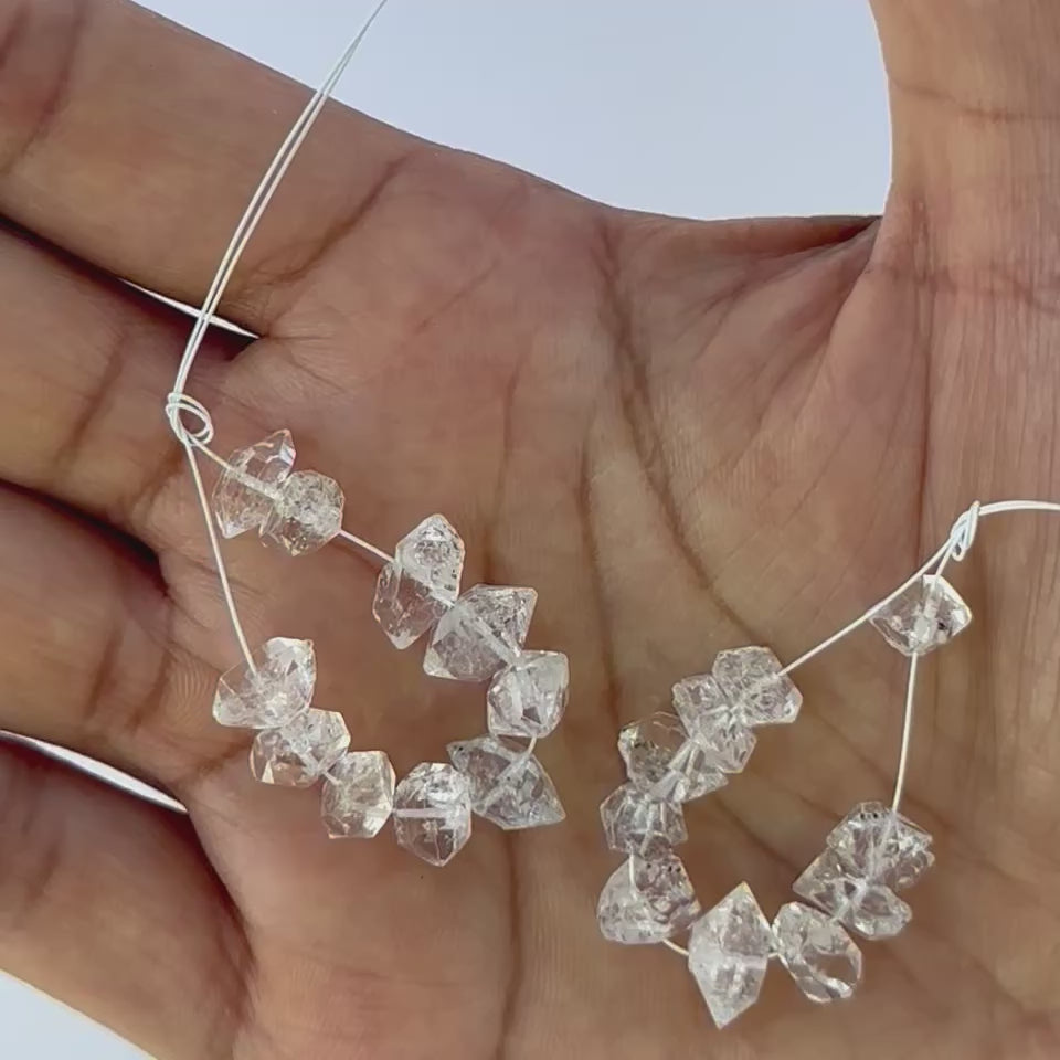 Natural Herkimer Diamond rough drilled crystals sized 7–9mm display bright clarity and the distinctive double‑terminated form prized in stone beads. As natural gemstone beads for DIY jewellery, these pieces offer versatility for handmade jewellery components, adding raw sparkle to wire‑wrapped designs or artisan creations. Explore their unique charm in your next design.